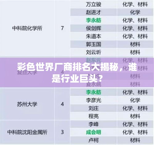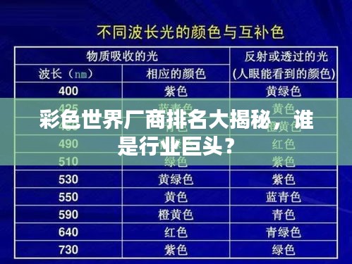 彩色世界,一個(gè)充滿活力和創(chuàng)造力的領(lǐng)域,各大廠商以其卓越的技術(shù)和獨(dú)特的產(chǎn)品贏得了消費(fèi)者的喜愛,在這篇文章中,我們將探討彩色世界廠商的排名,帶您了解這些引領(lǐng)行業(yè)潮流的佼佼者。