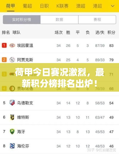 荷甲聯(lián)賽積分榜的競爭非常激烈,各隊實力差距較小,隨著賽季的深入,積分榜的排名會有所變化,球隊的狀態(tài)、引援情況、教練調整等因素都可能影響積分榜的變化,球迷們可以關注各隊的動態(tài),以及比賽結果和積分榜的變化情況,也要關注球隊戰(zhàn)術打法、球員狀態(tài)等細節(jié),以便更好地了解各隊的實力,還要關注比賽的實時情況,以便及時獲取最新的積分榜信息,球迷們可以通過各種渠道獲取比賽信息,如官方網(wǎng)站、體育新聞等,荷甲聯(lián)賽積分榜的競爭非常激烈,各隊實力均衡,排名變化多端,球迷們可以關注各隊的動態(tài)和比賽情況,以便更好地了解各隊的實力和戰(zhàn)術特點,也要關注比賽的實時情況,及時獲取最新的積分榜信息,這樣才能更好地享受荷甲聯(lián)賽帶來的精彩與激情,最后需要指出的是本文所提供的信息僅供參考具體排名請以實際最新積分榜為準讓我們共同期待荷甲賽場上的精彩對決和積分榜上的變化吧!??