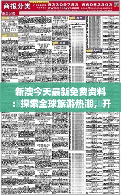 在全球范圍內(nèi),旅游業(yè)正迎來前所未有的熱潮。新澳今天最新免費(fèi)資料:探索全球旅游熱潮,開啟你的冒險(xiǎn)之旅,就是一本提供全球旅游熱點(diǎn)、文化探索和冒險(xiǎn)活動(dòng)的綜合指南。該書旨在幫助旅行者了解各地的風(fēng)土人情、自然景觀以及不斷涌現(xiàn)的旅游趨勢(shì),以便能夠科學(xué)規(guī)劃自己的行程,實(shí)現(xiàn)一次令人難忘的旅行體驗(yàn)。本文將詳細(xì)介紹這本資料的具體內(nèi)容。