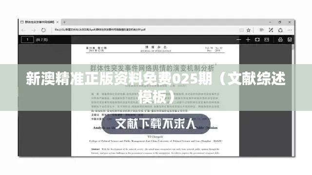 “新澳精準(zhǔn)正版資料免費(fèi)025期”是一份針對(duì)某一特定領(lǐng)域文獻(xiàn)的綜述模板。本文將詳細(xì)介紹該資源的內(nèi)容構(gòu)成,重點(diǎn)放在文獻(xiàn)綜述的結(jié)構(gòu)和寫作指導(dǎo)上,而不是對(duì)文獻(xiàn)內(nèi)容的深入探討。作為文獻(xiàn)綜述模板,它旨在為研究人員或?qū)W生提供一種框架,用以系統(tǒng)地歸納和評(píng)價(jià)相關(guān)學(xué)術(shù)資源和研究成果。