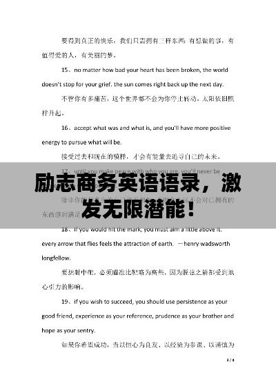 隨著全球化的進(jìn)程,商務(wù)英語已經(jīng)成為我們?nèi)粘I詈凸ぷ髦胁豢苫蛉钡囊徊糠郑诜泵Φ纳虅?wù)活動(dòng)中,一些勵(lì)志語錄可以鼓舞我們的士氣,激發(fā)我們的潛能,以下是一些關(guān)于商務(wù)勵(lì)志的英語語錄,希望能帶給您正能量和啟發(fā)。